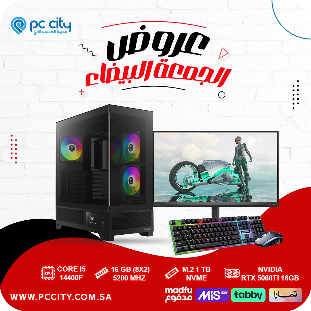 تجميعة العاب احترافية مع شاشة قيمنق 200 هرتز من بي سي سيتي – NVIDIA RTX 5060TI 16GB – CPU I5-14400F – RAM DDR5 16GB 5200MHz – 1TB M.2 NVME